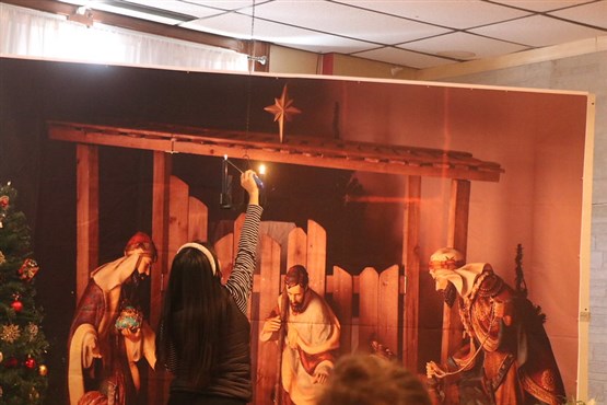 The Advent candles were hung from the ceiling, ostensibly lighting the stable scene of Mary, Joseph and baby Jesus in a large backdrop behind it.