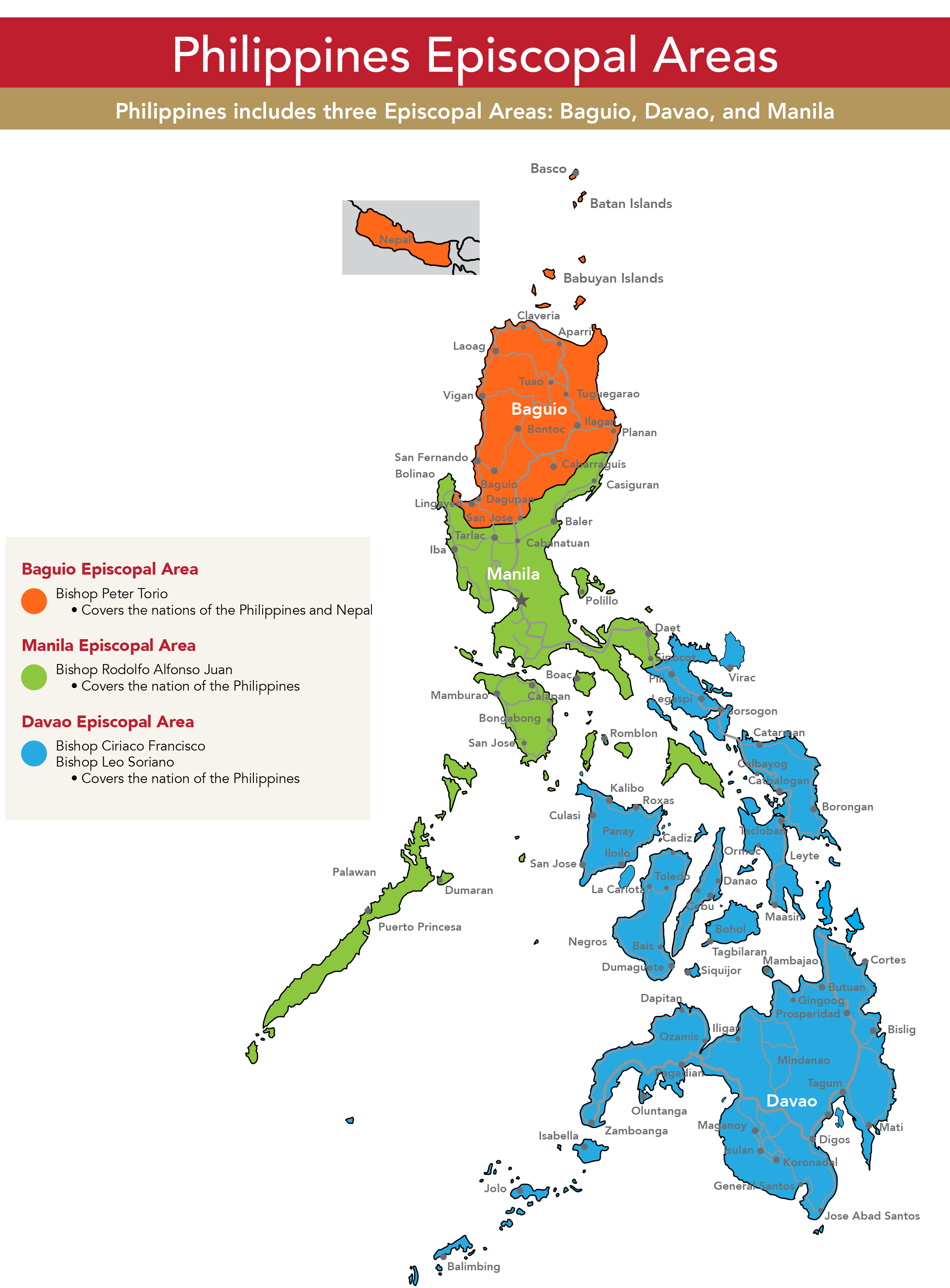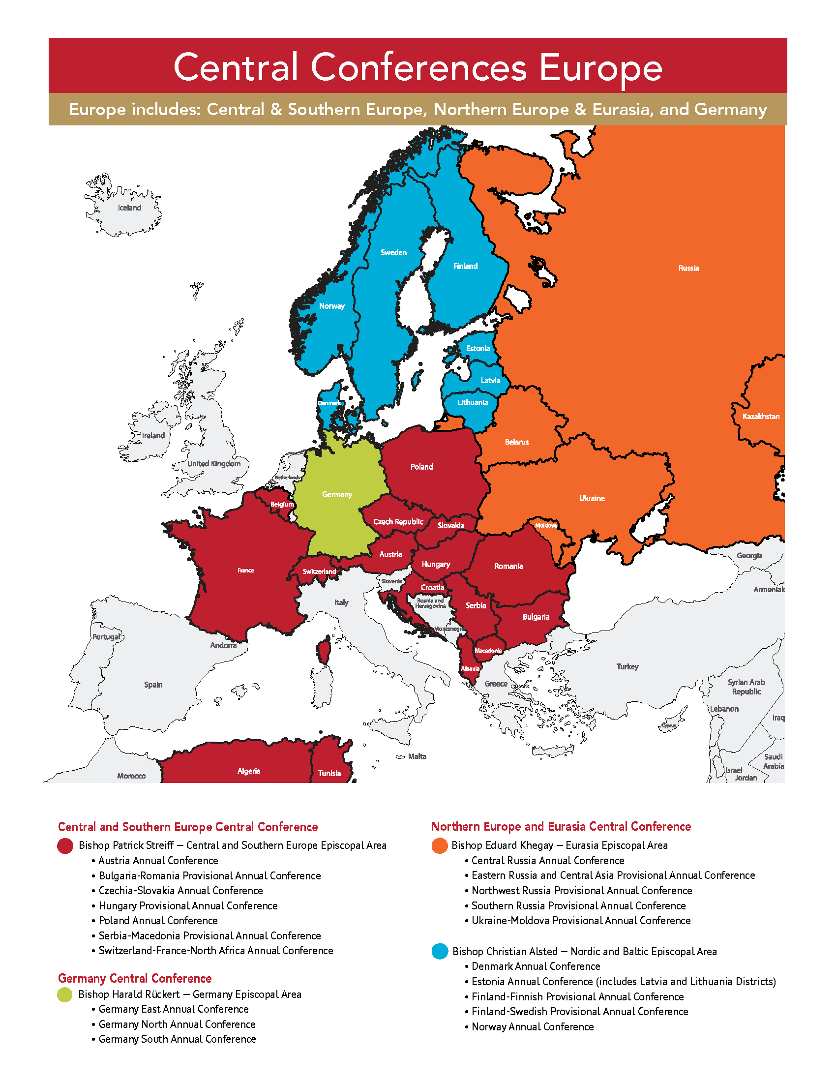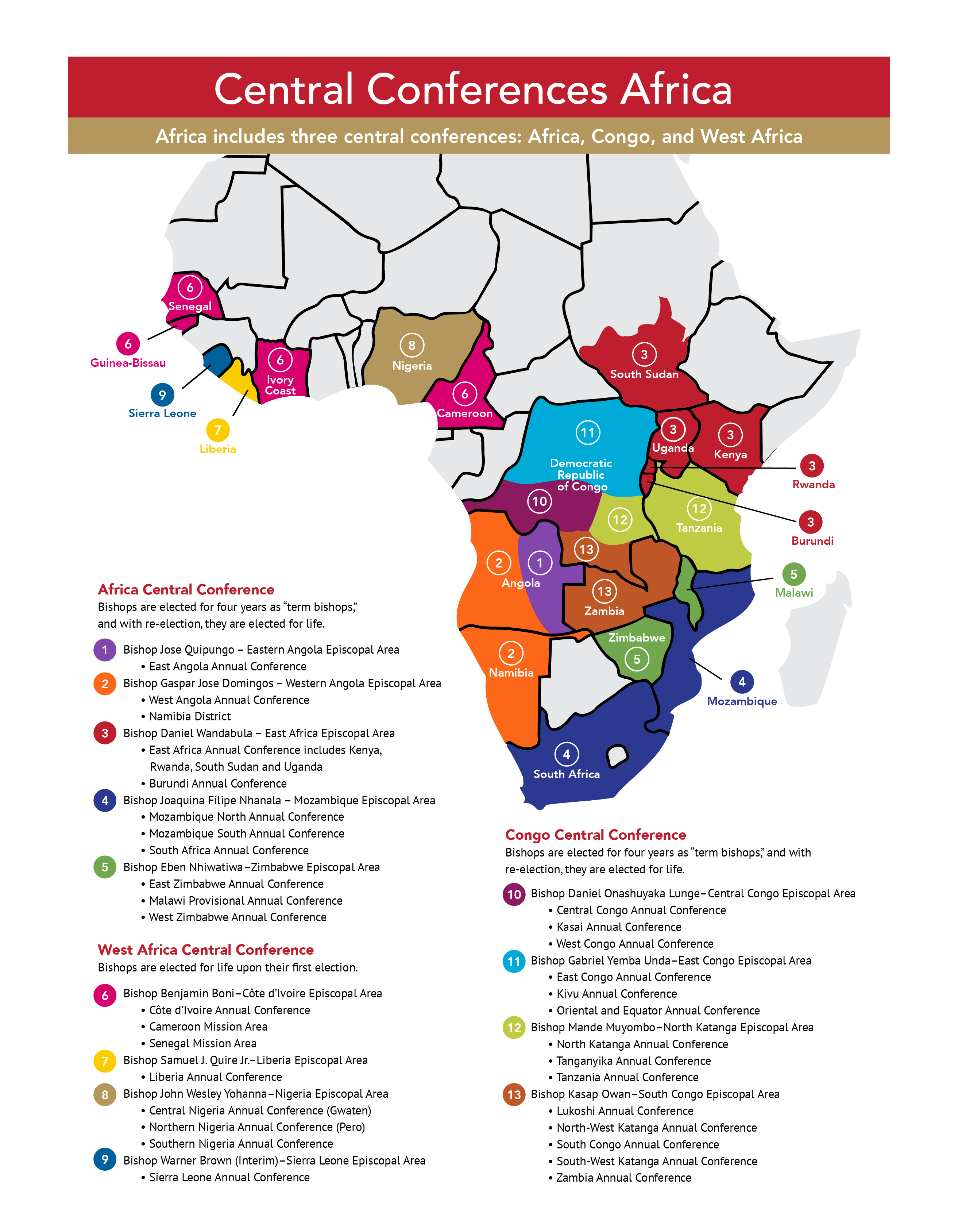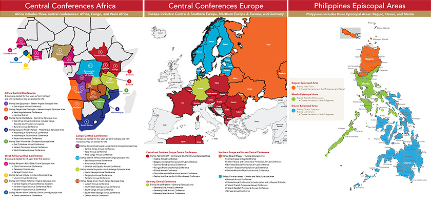 The United Methodist Church currently has central conferences on the African continent, in Europe and in the Philippines. More information about each of them can be found in these maps.